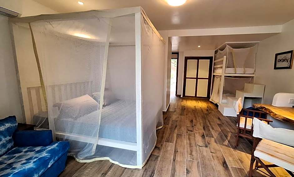 This studio has a refrigerator, a desk and a TV with streaming services. Kitchen facilities include an oven, a microwave, a cook top and a dishwasher.